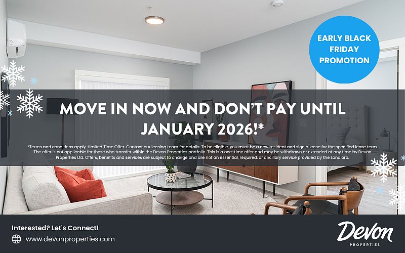 *Terms and conditions apply. Limited Time Offer. Contact the leasing team for details. To be eligible, you must be a new resident and sign a lease for the specified lease term. The offer is not applicable for those who transfer within the Devon Properties portfolio. This is a one-time offer and may be withdrawn or extended at any time by Devon Properties Ltd. Offers, benefits and services are subject to change and are not an essential, required, or ancillary service provided by the Landlord.