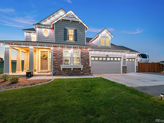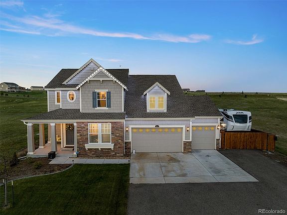 Welcome to your new home in desirable Elkhorn Ranch situated on 5.2 sprawling acres. This spacious open floor plan has 4 bedrooms and 3 full bathrooms, 3282 finished square feet above and 1517 square feet unfinished in the basement that is ready for you to create your own personal space. As you enter the home you are welcomed by a vaulted ceiling with an open staircase. The main level opens up to a large Great Room with a custom fireplace, a wall of windows and access to a covered back patio. The kitchen has stainless refrigerator, gas range, double ovens and a large slab granite eating island. A tech area is off the kitchen which serves as a mini office to manage your daily tasks. You will love the unique main floor bedroom with a full bathroom that can be used as an office or Mother-In-Law Suite. To complete the main level there is a conveniently located mudroom off the garage with a closet and cabinets. Main floor windows have been tinted. As you walk up the staircase, the upper level consists of a large loft, which could be configured into a 5th bedroom with 2 oversized storage closets. The primary bedroom has a 5-piece expansive bathroom with gorgeous picture windows, a large soaking  tub, with His and Hers dual vanities, beautiful tiled shower with bench and an amazing walk in closet. The primary suite has access to the laundry room with storage, utility sink & cabinets.Two additional bedrooms, each with access to a Jack-N-Jill bathroom complete the upper level. All upper level blinds are cordless. Your country retreat has ample space with a heated 4 car attached garage with a built in work bench, storage cabinets and wood shelving. A fenced in area off of the garage is ready for your camper or additional toys! Enjoy the close proximity to E470, Southlands Mall, grocery stores and restaurants.  ADDITIONAL BONUSES ARE A NEW ROOF WITH IMPACT RESISTANT SHINGLES INSTALLED IN 2024, MUST SEE JELLYFISH LIGHTS INSTALLED AROUND THE  HOME AND 2 FURNACES AND 2 AC UNITS.