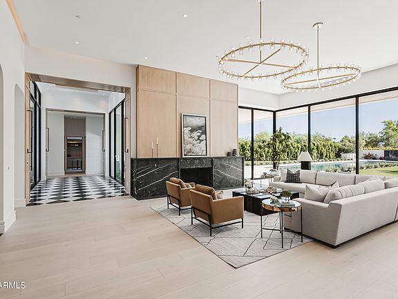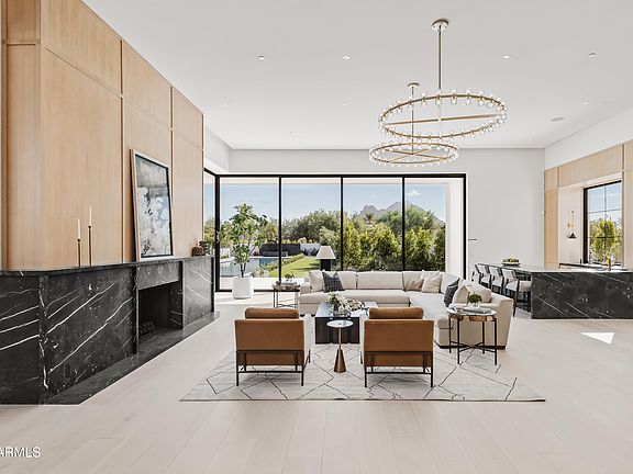 Experience timeless luxury and modern design in this newly constructed estate, expertly crafted by the renowned Folklore Interior Design Studio. Set on nearly one acre in the heart of Paradise Valley, this gated residence offers breathtaking views of Camelback Mountain, the Praying Monk, and Piestewa Peak. A grand front courtyard with serene fountains welcomes you into an exceptional living experience. Inside, the open-concept great room impresses with a wall of sliding glass doors, a custom gas fireplace, and a full bar—perfect for entertaining. The chef's kitchen showcases high-end appliances, a striking island, and a hidden back kitchen featuring a large walk-in walk-in refrigerator. The primary suite serves as a private retreat with its own gas fireplace, outdoor access, dual custom closets. Additional highlights include a formal dining room, wine wall, executive office, and wellness area with gym, sauna, and cold plunge. Step outside to a resort-style backyard featuring a custom heated pool and spa, outdoor shower, built-in BBQ, fireplace, fire pit, and a pickleball court. An unbeatable location close to Paradise Valley's premier resorts, spas, shopping, and dining completes this rare offering.