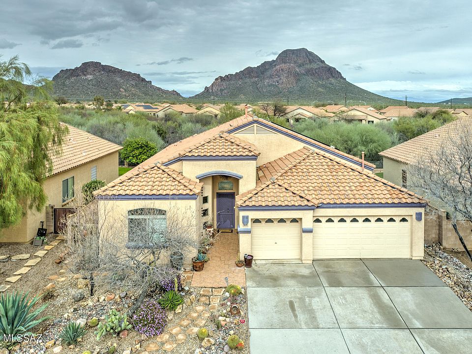 Spectacular VIEWS of the Tucson Mountains! Enjoy the sunrise on your private back patio while over looking the sparkling pool and desert green space to the rear of the property. NO NEIGHBORS BEHIND. Beautiful upgraded kitchen, Stainless appliances, 3 CAR GARAGE, split bedrooms, ceramic tile throughout with carpet only in the bedrooms. Office has new flooring. Springtime is a great time for a beautiful new home.