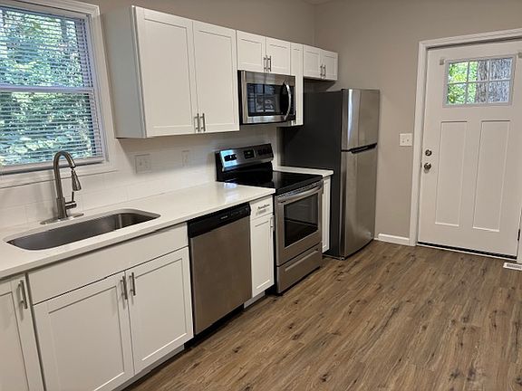 3 Bedroom, 1 bath home in a quiet, established East Point neighborhood. This fully renovated home includes new flooring, windows, window treatments, vanity, fixtures and cabinets. Kitchen has ample storage with white cabinets, granite countertops, stainless steel appliances, a separate area with stackable washer and dryer and room for a small dining table. The room off of the kitchen can be a 3rd bedroom, office or other. The renovated bath has entry from the main bedroom and entry from hallway. Fully fenced backyard has large patio and a fire pit. An additional small patio/entry is convenient to front door entrance. Driveway parking and additional off street parking. An additional outdoor building is ideal for storage or a workshop. Property is close to downtown East Point, schools, Marta, Hartsfield Jackson Airport and Camp Creek Marketplace.