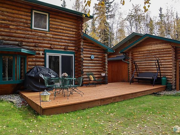 Charming Log Retreat with Custom Rustic Touches! Step into warmth and character in this stunning Scandinavian-notched log home, where handcrafted details and rustic charm meet modern updates. From the custom-made interior and exterior doors with hand-forged handles to the antler chandelier lighting the stairwell, every corner tells a story. The home features rich interior log walls, graceful archways, and two cozy bay windows—one complete with a window seat and hidden storage. The fully remodeled kitchen is a showstopper, boasting beautiful solid-surface countertops, custom cabinetry, tile flooring, and a spacious pantry cabinet perfect for all your kitchen essentials. Upstairs, the primary suite feels like a private escape with its cedar-lined walk-in closet and a peaceful balcony overlooking the trees. Outside, enjoy the serenity of your wooded lot from a freshly built rear deck, and rest easy under a brand-new roof designed to last. But that's not all—this property also includes a 3-car detached garage with built-in cabinets, perfect for vehicles, tools, or a workshop. A lean-to covered area on the side offers additional sheltered storage, ideal for ATVs, firewood, or gear. The asphalt driveway provides clean, reliable access year-round, and two exterior cold storage areas offer even more utility for your Alaskan lifestyle. Come see this one-of-a-kind home in person and fall in love with its timeless Alaskan charm