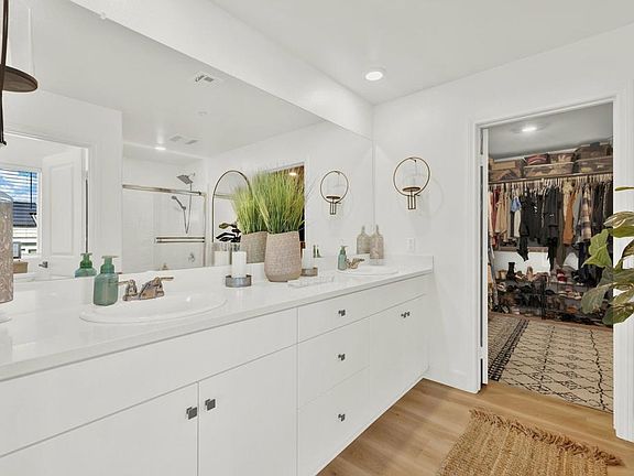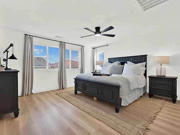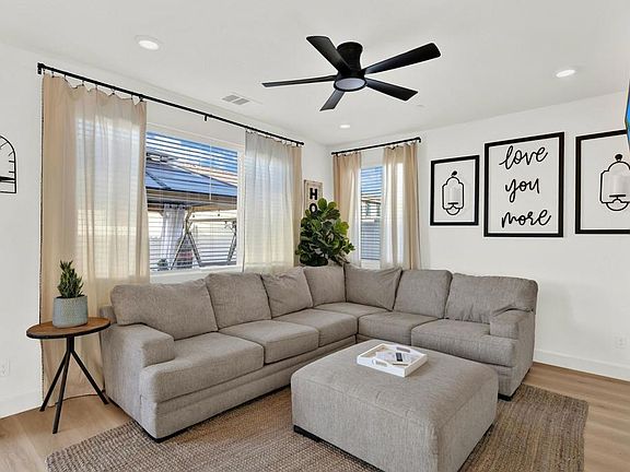 Price reduced! – Best buy in the community! Move right in and enjoy all the upgrades in this stunning two-story modern home. The flexible floor plan includes a full bedroom or office and a full bathroom on the main level, ideal for guests or working from home. The open-concept layout features a sparkling kitchen, dining area, and family room, all set on upgraded luxury vinyl plank flooring, with a custom shiplap fireplace as a stylish focal point. Upstairs, you'll find a spacious loft, the primary suite, two additional bedrooms, a full bathroom, and a convenient laundry room. The backyard is perfect for entertaining with a stamped and stained concrete patio, gazebo equipped with misters and smart lights, a dog run, and pet-grade turf in both the front and back yards. Designer touches throughout the home include a custom entry wall, custom barn door in the primary bed/bath, wainscoting in the secondary bathrooms, upgraded matte black knobs and handles, statement chandeliers, smart switches and door lock, and solar with a Tesla backup battery. This home is packed with modern finishes and thoughtful upgrades—don’t miss your opportunity to own the best value in the neighborhood.