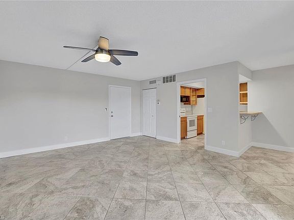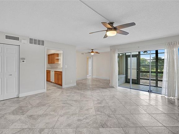 This condominium offers an inviting and open living space with several newer updates. The bright and spacious floor plan features a large living room, complemented by a separate dining area that is perfect for entertaining or enjoying daily meals. The kitchen is equipped with a breakfast bar, providing a convenient spot for casual dining, and tile flooring throughout adds a touch of modern style and easy maintenance. Step out onto the screened porch located at the rear of the unit, where you can relax while overlooking the scenic golf course and a distant lake, creating a peaceful and picturesque setting. The bedroom is generously sized and includes a large closet for ample storage. The bathroom has been updated with a new vanity, enhancing both functionality and appearance. An extra storage locker is available in the storage closet, providing additional room for your belongings. The washer and dryer are conveniently located in the condo's private utility closet in the front entry area, ensuring laundry tasks are easily managed. This highly sought-after location is just a 10-minute drive from downtown Naples and the beautiful beaches. Nearby plazas offer shopping and dining options for your convenience. Residents have the option to join the Lakewood Country Club, where they can take advantage of extra amenities such as golf, tennis, pickleball, and a clubhouse with dining facilities. Residents of the complex enjoy access to a community pool. The condo also includes a one-car carport and plenty of guest parking, making it easy to host visitors.