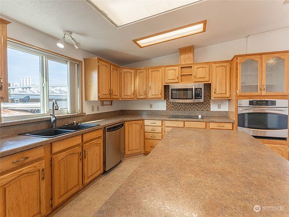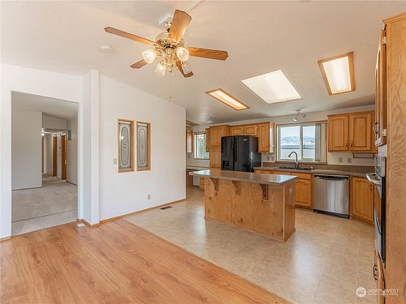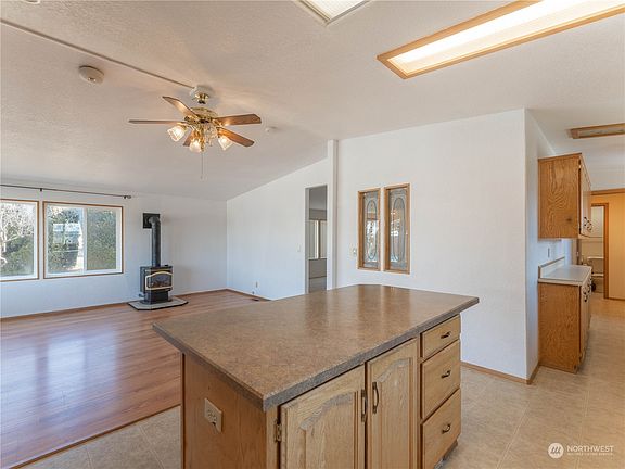 Large manufactured home in Mountain View Mobile Estates 55+ park. This 1991 Marlette has a nice layout with 3 bedrooms & 2 bathrooms. Large light filled and vaulted great room with views towards the Cascade Mountains, open kitchen with island, window over the sink, and skylight. Separate living room with vaulted ceilings. The primary bedroom is oversized and has a large closet and private bathroom with soaking tub, separate shower, & double sink vanity. The lot this home sits on feels private and has a quaint back yard, large side deck, and carport with enclosed storage area plus covered storage. New carpet and much of the interior has fresh paint.