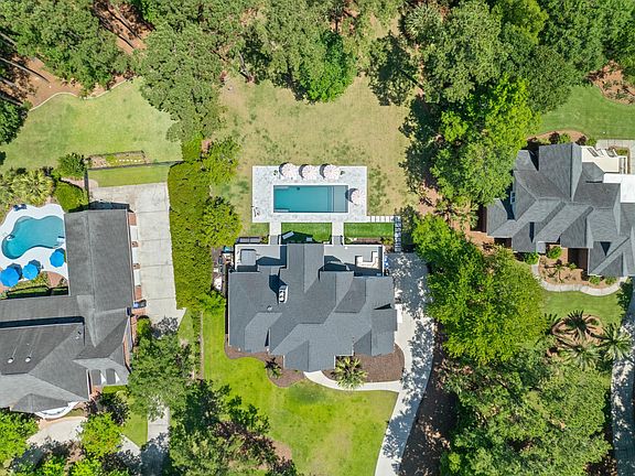 Discover luxury living in this six-bedroom, six-bath home on a spacious one-acre lot in the desirable Dunes West community. Located on the 2nd hole of the golf course, this property features a heated pool for relaxation and entertainment. With 4,521 sq ft of well-designed living space, recent updates include a built-in bench in the breakfast nook, hardwood floors throughout the upstairs, new window treatments, and new lighting fixtures. This home showcases a two-story living room with lots of windows filtering in bright natural light. The open concept kitchen features a large island, perfect for gathering and entertaining. Additionally, there's a dedicated separate dining room and formal living/office with glass french doors. This home combines thoughtful upgrades with a prime location