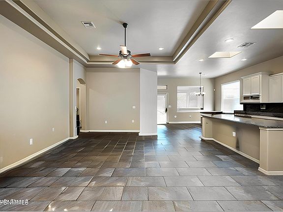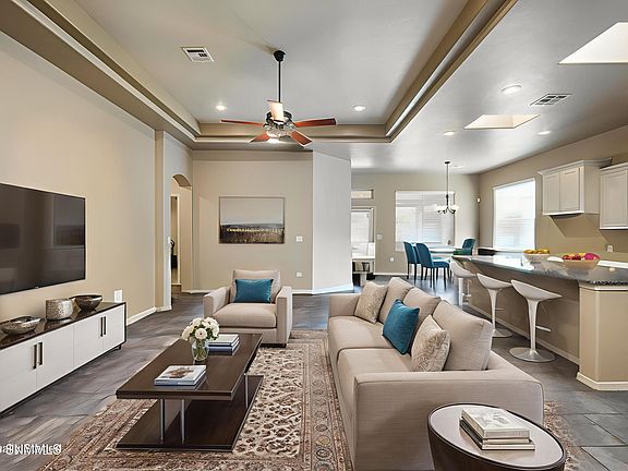 Beautifully appointed home featuring paid-off solar power and a Spanish Colonial exterior with a stained concrete driveway. The gourmet island kitchen offers painted white cabinets, granite countertops throughout, subway tile backsplash, stacked ovens with microwave, and soft-closing cabinetry. Elegant oil-rubbed bronze hardware, lighting, and plumbing fixtures add warmth, while recessed lighting brightens the living room and kitchen.The primary suite boasts his-and-hers closets, a soaking tub, walk-in shower, double sinks, and framed mirrors. The Jack & Jill secondary bathroom also includes double sinks and framed mirrors. Additional highlights include a powder room with linen closet, entryway and kitchen skylights, utility room with built-in skylights, and 2-inch faux wood blinds throughout.Outdoor living is enhanced by an extended patio and six-foot privacy rock walls. Practical touches include a garage door opener with keypad and plenty of storage space. Living room photos use AI to remove furniture.
