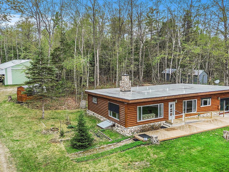 Probate is done and price is reduced! Ready to buy! Envision the possibilities with this truly unique property, boasting 186' on desirable Mullett Lake and just under 7 acres of sprawling Northern Michigan land. Perched with a breathtaking view of the pristine waters, access to the fitness/snowmobiling trail, and the Famous Inland Waterway. While this charming home eagerly awaits your personal touch and modern updates, its unparalleled prime location and exceptional features provide an incredible and solid foundation upon which to build your ' Up North' dream. Admire the authentic log cabin-style siding that exudes a timeless rustic charm, perfectly blending with the natural beauty of the surroundings. Step inside to find a generously sized living room that flows effortlessly into the dining room and a well-laid-out kitchen. Furthermore, an additional family room awaits your creative vision, offering ample space for cozy relaxation, lively gatherings, and crafting cherished memories. It is the expansive outdoor space where this remarkable property truly shines. A substantial pole barn, complete with convenient lean-tos, offers incredible storage solutions for your boats, RVs, recreational equipment, or the workshop of your dreams - the possibilities are as boundless! And just a stone's throw across the road and over the scenic Rails to Trails public path, you'll discover 186 feet of coveted waterfrontage on the sparkling shores of Mullett Lake. This location promises fantastic fishing, refreshing swimming, exhilarating boating adventures, and seamless access to the renowned Inland Waterway!! You'll have an abundance of room for creating gardens, engaging in outdoor recreation, or simply savoring the unparalleled peace and privacy that Northern Michigan is celebrated for. Adding to its unique and compelling appeal, the property also features an additional piece of property that would be perfect for a detached garage or area to add a septic if someone wanted to expand or put up a larger home in the future. The future development possibilities are endless. This is a truly rare and exceptional opportunity to own a substantial piece of land with valuable lake access and a solid, character-filled structure just waiting for your transformative touch. Don't let this incredible chance slip away to transform this property into your perfect place where memories are made and dreams come to life on the shores of magnificent Mullett Lake!