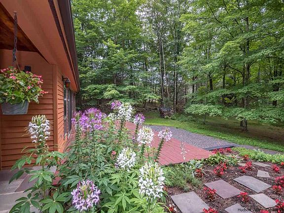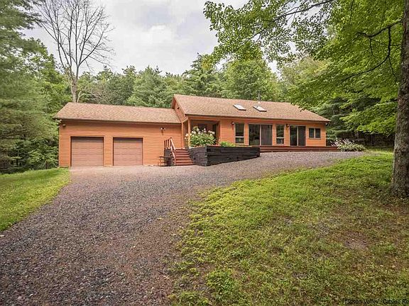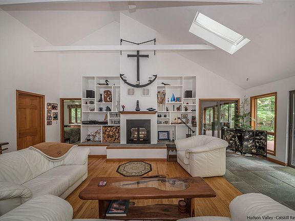 Cedar sided contemporary ranch with modern open floor plan. Great room is sun filled with cathedral ceilings, beams, wood insert fireplace, built-ins and skylights. Enjoy the natural light. Nestled in the woods with a private setting and just minutes to Stone Ridge center and the Ashokan reservoir. Master en suite offers large walk in closet and updated bathroom. This is one level living with attached garage. Delightful screened porch in rear and deck in front. Eat in Kitchen with over sized pantry and separate dining room. Recent improvements include new roof in 2007 with 30 year shingles. 3 zone furnace in 2000. New appliances 2008. Nature's best surrounds you as the seasons unfold in your very own Catskill retreat. Less then 2 hrs. to NYC