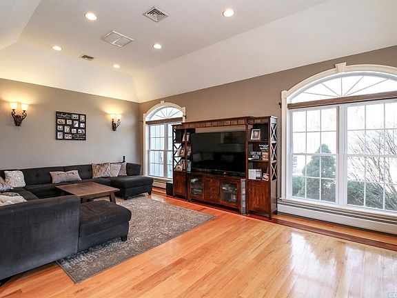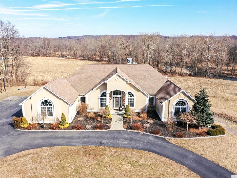 This light-filled contemporary is located in the town of Clermont, & Red Hook school district. The open floor plan has incredible living volumes, spilling w/natural light from Palladian-style windows that showcase views of the neighboring landscape & Roe-Jan river. The main living expanse is anchored by a wall of glass, bringing the outdoors in, & highlighting the in-ground pool complex. The LR, DR & FRs feature oak & inlaid mahogany floors, & the gourmet kitchen includes custom antique-white cabinetry, stainless appl & granite. The master suite has gleaming HW flooring, a private balcony & spa-like BTH w/Kohler garden tub, steam shower & huge WIC. Down the hall are 2 addt'l BR's that share a Jack&Jill BTH, & a 4th BR/office. The lower level features a custom bar, gaming area, theater & is steps from the pool/hot tub. Efficient systems: propane forced air / baseboard / radiant heating & central air, A fully equipped guest suite further compliments this special property.