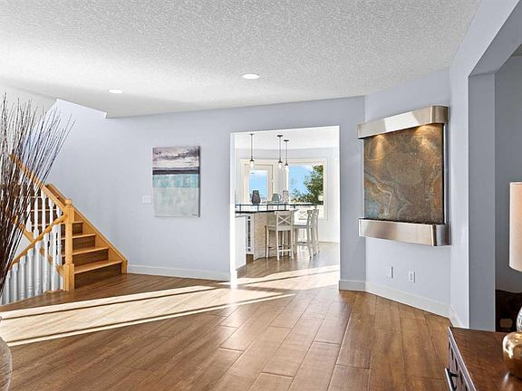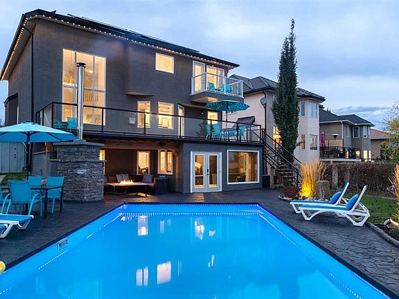 Nestled among the rolling hills of Patterson, this stunning 5-bedroom, 3.5 bath executive home combines elegant design, smart technology, and resort-style amenities—perfect for the modern family. As you enter the grand foyer, you’re greeted by a tranquil spa-inspired water feature, setting the tone for the sophistication that follows. The main living area boasts soaring 17’ ceilings, a cozy gas fireplace, and vinyl plank flooring throughout, creating an airy and inviting atmosphere. The gourmet kitchen is a chef’s dream, featuring granite countertops, a large entertaining island, built-in fridge, and gas range. Step outside to the massive deck, fully updated in 2024, where you can take in sweeping views of Calgary’s skyline. Adding to the functionality of the main floor are a formal dining room, front sitting room/office, and laundry/ mud room area - that leads into the attached oversized double garage. Upstairs, the primary suite offers true luxury—complete with a private balcony, a gorgeous ensuite featuring a Jacuzzi tub, heated floors, double vanity, stand-up shower as well as a generous walk-in closet. Two additional bedrooms, a loft area ideal for a home office, and another full bathroom with heated floors complete the upper floor. The fully finished walkout basement is an entertainer’s dream, featuring a second gas fireplace, two more bedrooms, a full bathroom, and even a kitchen area for hosting epic movie nights or game days with friends and family. The newly built flex/workout room includes rubber flooring and is pre-wired for a hot tub. Step outside to your own backyard paradise—a professionally landscaped oasis designed by an architect, featuring a 16’x32’ heated in-ground pool surrounded by stamped concrete decking, custom lighting controlled by app, and a retractable Elephant Cover for safety and convenience. Enjoy your favorite music indoors and out with the fully integrated sound system across all levels, and relax in the covered outdoor living area with a dual wood/gas fireplace and built-in Weber BBQ. There is also a gas hook up for a fire table. This home is move-in ready with new exterior finishes, solar panels reducing energy costs by approx. $300/month, programmable Gemstone lighting, in-ground irrigation, central A/C, central vac, two furnaces, two hot water tanks, water softener, keyless smart entry on all doors, and a new garage door (2024). Every inch of this home has been thoughtfully curated to deliver comfort, elegance, and entertainment—all with breathtaking views of the Bow River and Calgary’s west side. Move-in ready and built for making memories.