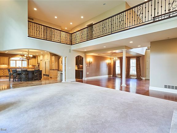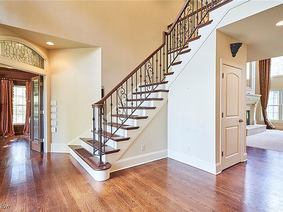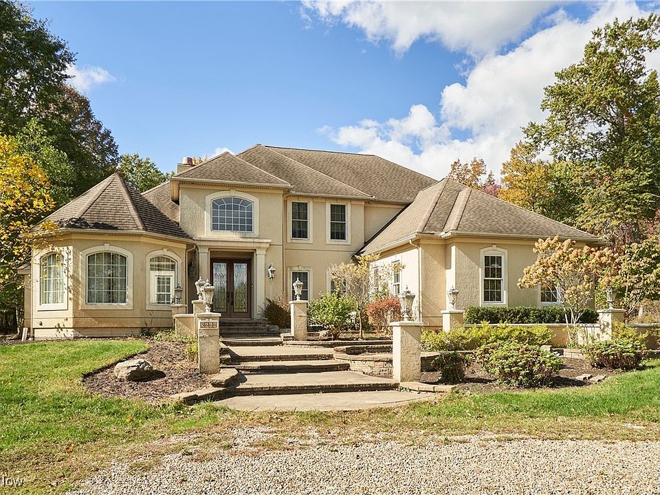 Experience the allure of an Italian villa with this custom-built home, blending luxury, seclusion, and master craftsmanship. Exuding timeless elegance, it features custom wrought iron and imported Italian accents. The formal dining room boasts a tray ceiling, while the two-story great room, with its hand-carved travertine marble fireplace mantel, adds grandeur to the space. The gourmet kitchen is a chef’s dream, featuring Daso custom cabinetry, double islands with granite countertops, and Wolf/Sub-Zero appliances, including double ovens. A built-in wine cabinet, ice maker, and butler’s pantry with a custom tile rug complete the space. Adjacent to the kitchen and sunroom, the outdoor pavilion draped in wisteria offers a tranquil retreat with a wood-burning fireplace, and fully equipped outdoor Wolf kitchen. Designed with practicality, the mudroom doubles as a pet grooming area and is fully plumbed for a first-floor laundry. The library is a masterpiece, with a vaulted dome ceiling, built-in bookcases, and fireplace. The primary suite offers a hand-carved Italian fireplace, and its luxurious bath includes imported Italian tile, antique climbing rose leaded glass, a double vanity, shower, two-person jacuzzi tub with UV sanitizing light, and two walk-in closets. The suite also has a connected nursery/private office. An elevator leads to a loft sitting area and three bedrooms, each with unique features, such as en-suite baths, bonus rooms, and skylights. The lower level features a family room with a fireplace, second kitchen with Corian countertops, wine room with stone walls and fountain, and a home theater with tiered seating. The lower level also has large wet bar, rec room media room , full bath, office, laundry room, and an unfinished room . This home is tucked off the road with over 4 acres of yard and woods. There is over 4700 sq ft on the first 2 floors and and additional 2000 on the lower level.