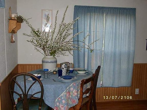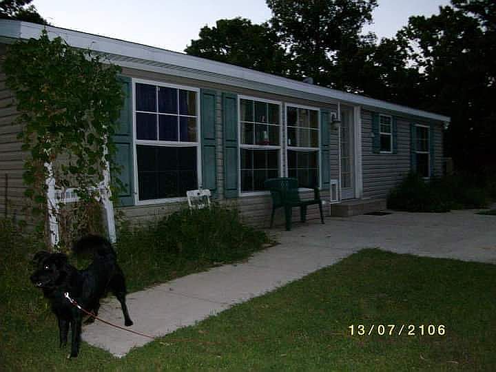 Three bedroom, two bathroom double-wide mobile home on 5.62 acres at the top of a hill. Master bath has a large garden tub. Small barn, pond and coop on the mostly wooded property. Ceramic tile and hardwood floors. Electric heat and central air, town water and garbage collection. Sold as is.