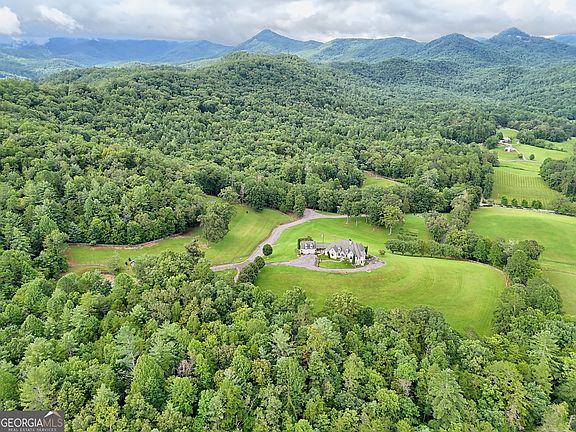 This legacy-worthy farm, situated on the Blue Ridge Divide, offers the safe and serene retreat your family deserves. With stunning mountain views in every direction, the natural beauty enhances the exquisite design and craftsmanship found throughout the property. The farm features three homes: a luxurious 6,000+ sq ft primary residence recently refreshed with a modern appeal, a custom log guest home nestled by a mountain stream, and an antique log cabin that overlooks the vineyard. Additional buildings include a beautifully reconstructed antique timber-frame barn; a perfect home for your vintage truck collection or for hosting parties. There's also a horse barn with stables and a riding ring, plus a work barn and tractor sheds. The sprawling 80+ acres boast creeks, fish ponds, ATV trails, and even a mountaintop lookout tower, ensuring plenty of fun and adventure. Every aspect of this remarkable retreat reflects thoughtful design and care with many additional features to create a luxurious and sustainable retreat for your family. Located just minutes away from Clayton, Rabun Gap, Lake Burton and only two miles from Heaven's Landing, a fly-in community featuring a mile-long concrete airstrip and hangars, guaranteeing easy access from anywhere in the world. A video tour is available for those interested.