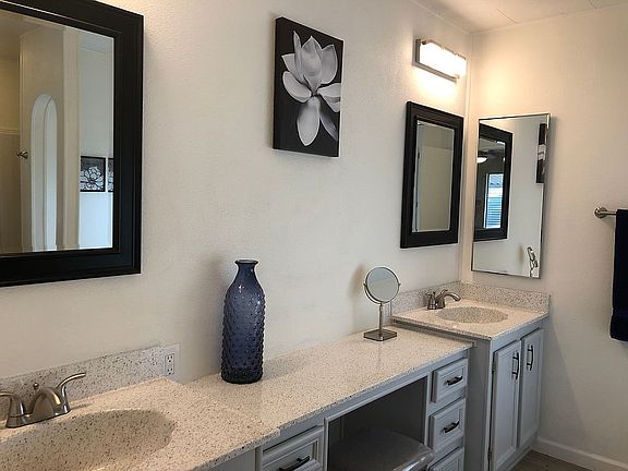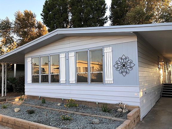 NEWLY REMODELED HOME! New energy efficient roof, all new plumbing, new water heater & new water resistant laminate flooring! Ready to move in September 1st. Call Missy at (951) 444-9004 to make an appointment to see this home at Village Riverside MHP, one of the most desirable communities in town! You will love this beautifully clean, open, light, bright and VERY SPACIOUS home. Walking in the front entrance, you will feel free to move about the generous main living areas of the home, into the completely renovated kitchen, with new cabinets, granite countertops, stainless steel sink and pull out faucet, oven/range. Walk, then, into the front bonus room, which could be used as an office, a 3rd bedroom, an entertainment room, or a breakfast nook, whatever you desire! Back through the kitchen towards the hallway, you'll pass the very large laundry room and find the newly remodeled (full) guest bathroom, guest bedroom, and finally, the large master bedroom and bath. Both bedrooms, bonus room and main living area all have ceiling fans. The master bedroom has a walk-in closet, with mirror closet doors. The master bathroom offers his & her (dual) sinks and a vanity area. It also has both a shower and a garden tub because, lets' be real, at the end of a long day, sometimes we just need a nice, long bubble bath ;) Lastly, if you like the outdoors, you will love the huge covered porch, accessible to/from a sliding glass door or the front door to the main living areas of the home. Call Missy @ (951) 444-9004 to make an appointment to see this beautifully remodeled home. Space/lot rent for this home will be $900/mo. Buyer needs to qualify with park.