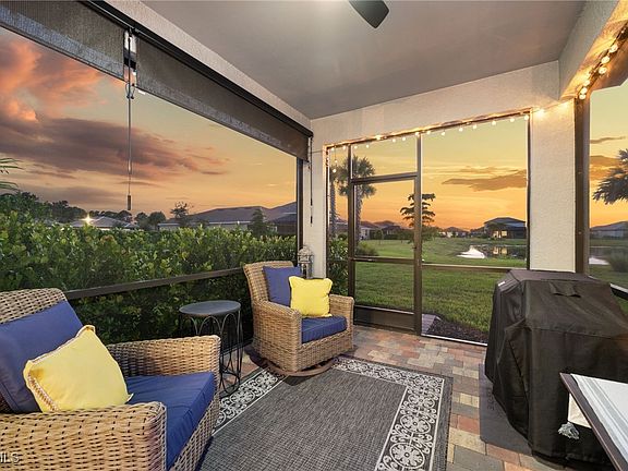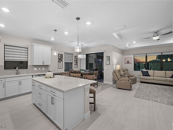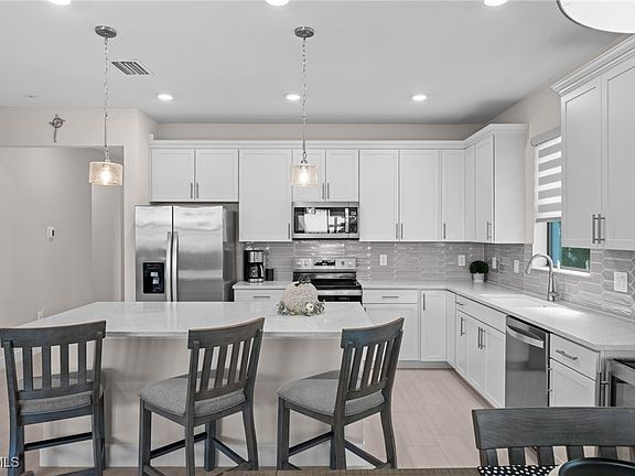 Why wait to build when you can have nearly new? This light and bright 4-bedroom Pulte home is loaded with upgrades and ready for immediate move-in. The spacious kitchen features quartz countertops, a sleek tile backsplash, 42" upper cabinets with crown molding, a Silgranite Blanco sink, stainless steel appliances, a large island, raised wood cabinetry, and a walk-in pantry—perfect for everyday living and entertaining. The open concept design is enhanced with wood plank tile flooring throughout, crown molding, and an upgraded trim package including 5 1/4" baseboards, 3 1/4" casing around windows and doors, and 8' interior doors. The home also features upgraded faucets, light fixtures, and designer touches throughout. The owner’s suite offers dual sinks with quartz counters, a spacious walk-in closet, and a tiled walk-in shower accented with a glass tile border. All bathrooms feature quartz counters, and the home is filled with natural light and serene lake views from the living areas and lanai. Upgrades you won’t find in standard builder models include: a 4-foot extended garage with epoxy floor (room for two cars plus a golf cart), a 4-foot extended screened lanai overlooking the water, and gutters around the entire home. Upgraded landscaping completes the exterior. Located in the highly desirable River Hall community, residents enjoy resort-style amenities including a lagoon-style pool, fitness center, clubhouse, tennis, pickleball, and basketball courts, plus miles of walking and biking trails. Golf enthusiasts will love the optional championship golf course within the community. Why wait for new construction when this nearly new, fully upgraded lakefront home is ready for you now?
