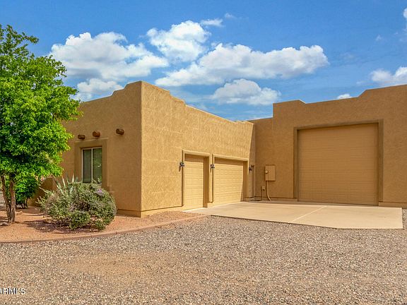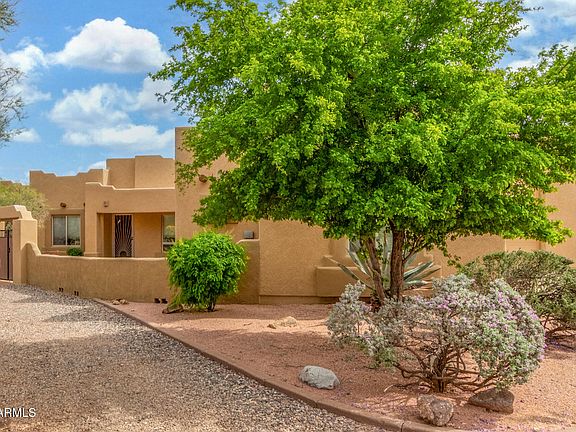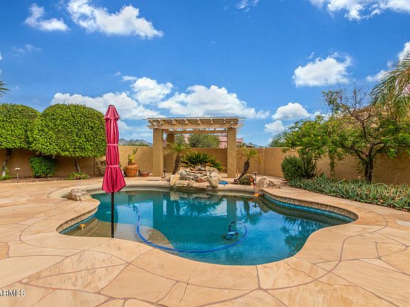 Stunning Santa Fe-style home on a quiet cul-de-sac! Features 3 beds, 2 baths, plus a den/optional 4th bedroom. Gated courtyard entry, beehive fireplace, formal dining, and chef's kitchen with granite, stainless appliances, island, and breakfast bar. Laundry room with sink and cabinets. Backyard oasis with mountain views, sparkling pool with boulder waterfall, flagstone seating, covered patio, and Ramada. 3-car garage with built-ins, workshop, air compressor, lift, and RV garage with rear access. A true Southwest gem!