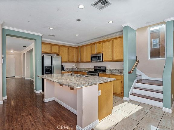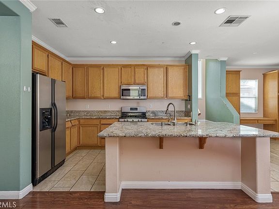 Paid off Solar!!! Nestled in the highly sought-after Village of Avalon community in the beautiful city of Perris, this stunning four-bedroom home offers a perfect blend of charm, comfort, and functionality. Featuring a traditional floor plan with soaring ceilings and recessed lighting throughout, this residence is ideal for buyers seeking ample space for family gatherings and entertaining. The inviting family room serves as a prime entertainment space, complete with a cozy fireplace and an open layout that seamlessly connects to the spacious kitchen and informal dining area. The well-appointed kitchen boasts an oversized center island with exquisite granite countertops, a breakfast seating overhang, additional cabinetry, a built-in dishwasher, and a stainless steel double-basin sink. Complemented by stainless steel appliances and extensive counter space, this kitchen is a true culinary delight. A tucked-away, naturally lit staircase leads to the expansive second-floor landing, offering additional storage and access to the private upstairs laundry room. The luxurious master suite features a generous walk-in closet, while the master bathroom—enhanced by a stylish custom barn-style door—includes a large vanity with stone countertops, dual sinks, a sunken tub, a separate shower, and a private restroom. Three additional guest bedrooms are thoughtfully designed and share a spacious full bathroom with dual sinks and a shower-tub combination. The outdoor living space is equally impressive, featuring a fully covered California patio, low-maintenance artificial turf, and a large side yard ideal for additional storage or customization. This home presents an incredible opportunity to create a truly spectacular family retreat. Welcome home!
