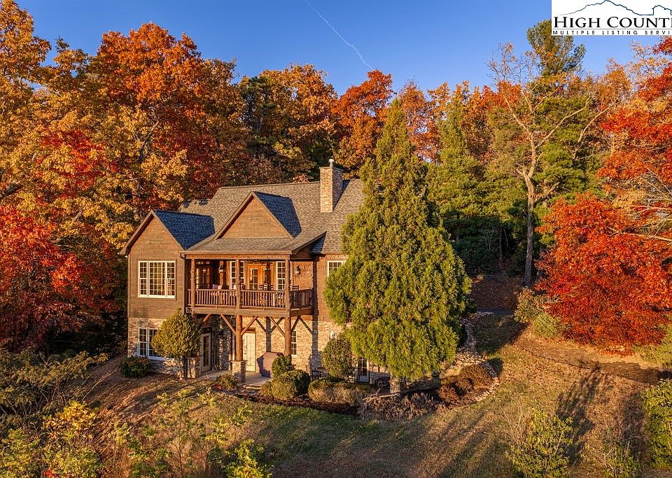 The gourmet kitchen is outfitted with Woodmode cabinetry, granite countertops, top-of-the-line appliances, and a large island with an additional sink and bar seating. The dining area sits in a charming alcove surrounded by windows, immersing you in mountain vistas while you dine. Both the living and dining areas open onto a covered back deck—an ideal space to sip your morning coffee or unwind with a glass of wine at sunset. From this vantage point, you can see iconic peaks including Hawksbill, Table Rock, and Grandfather Mountain.