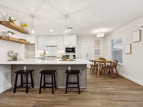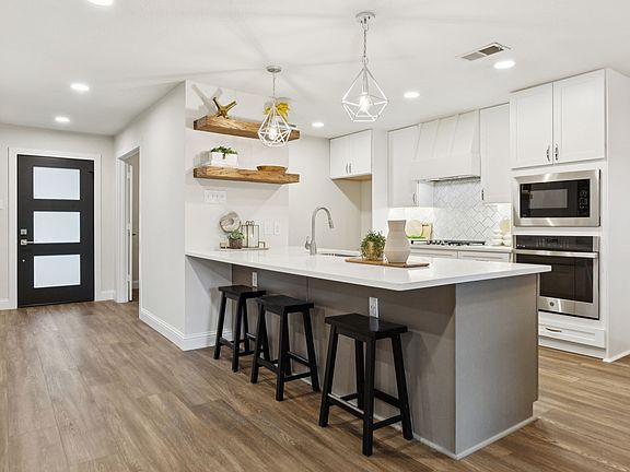 The heart of the home is the stunning kitchen, featuring quartz countertops, new cabinetry, a gas cooktop with a sleek vent hood, spacious pantry, and a breakfast nook. A large bar with seating for multiple barstools creates the perfect setting for casual meals and entertaining.
