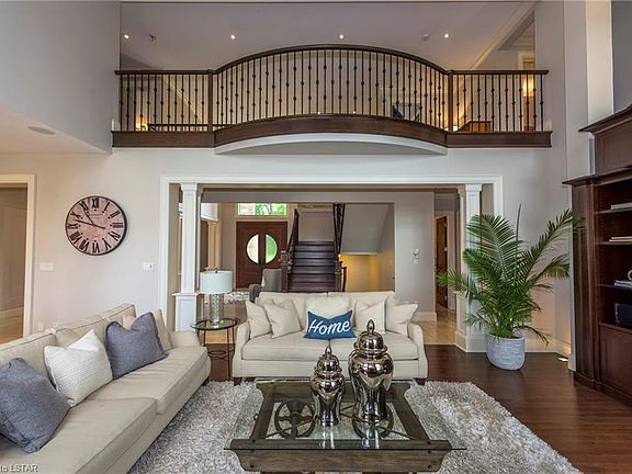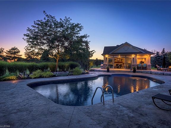 Spectacular Country Estate on approx 4 acres of lush grounds offering a luxury resort lifestyle. Meandering drive leads to stately executive home showcasing approx. 5500 sq ft above grade + finished walk up lower level, 800 sq. foot cabana, attached 3 car garage & detached double car garage/shop. Premium finishes & beautiful design includes soaring 19 ft 11 in. coffered ceiling, 10 ft main floor ceilings, extensive millwork & built ins. Fantastic kitchen/ great room design ideal for entertaining. Main floor master suite w/ private laundry & luxe ensuite. 2nd laundry on main. Four 2nd floor bedrooms w/ ensuites. Impressive lower level wet bar & lounge opening onto separately fenced pool & patio. Covered deck w/ fireplace. Cabana w/wood burning fireplace, bar & pizza oven. Stargaze around the firepit. Well-fed irrigation system. Radiant heat all main floor tiles/Lwr Lvl/garage. Full video/alarm interior/exterior cameras. Integrated surround sound. 20 min. to Victoria hospital.