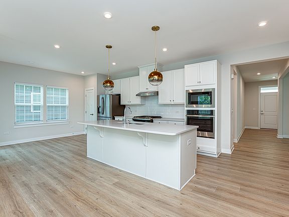 Welcome to this beautiful, turnkey ranch home that exudes modern elegance and functionality. Step into a neutral and bright interior highlighted by recessed lighting and Luxury Vinyl Plank flooring. The open floor plan includes two spacious bedrooms and two full baths, along with a versatile flex room for formal dining or it is perfect for a den, office, or additional bedroom. The gourmet kitchen is a chef's dream, featuring smart stainless steel appliances including a built-in oven and standalone oven/stove, a huge island with breakfast bar, a pantry, and an eating area for table and chairs. Bright sliders lead to a back covered porch overlooking the pretty fenced yard, ideal for outdoor relaxation and entertaining. The great room impresses with tall ceilings and a cozy fireplace, creating a welcoming atmosphere for gatherings and everyday living. The large primary bedroom boasts a tray ceiling, a spacious walk-in closet, and a luxurious ensuite bathroom with an extra wide shower. Additional highlights include a huge full basement ready to finish, complete with roughed-in plumbing for a bathroom and an egress window for potential bedroom or additional living space. This home also offers smart appliances, pre-wiring for a security system, and a WiFi thermostat, enhancing comfort and convenience. Located in a desirable neighborhood with amenities such as a clubhouse, pool, parks, and playground just minutes away. This home combines the best of modern living with nice community amenities. Perfect for those seeking a move-in ready home without the wait or increased construction costs of new builds.