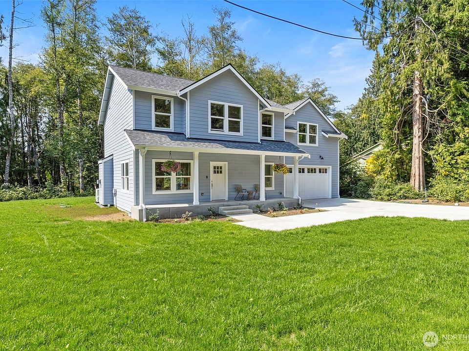 Discover your dream home in scenic Hansville! This beautiful new construction offers modern comfort just minutes from beaches and hiking trails. Enjoy a light-filled open floor plan and a gourmet kitchen with stainless appliances, gas cooktop, and a waterfall-edge island. The spacious drop zone includes custom built-in storage for everyday ease. Relax in the luxurious primary suite featuring a spa-like bath with heated tile floors and a large shower. Energy-efficient mini splits with A/C provide year-round comfort. The versatile bonus room is perfect for a home office or media space, with PUD fiber optics ready at the street. Style meets function in this exceptional Hansville gem!