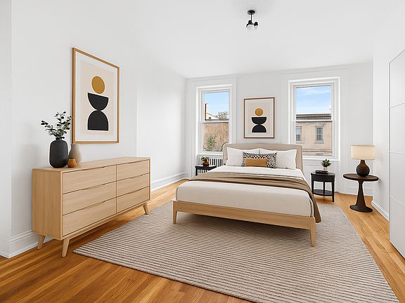 Large primary bedroomStainless steel appliancesCharming brownstone blockNewly-updated kitchenLarge wall of windowsAmple closet space