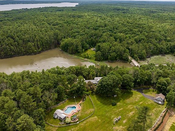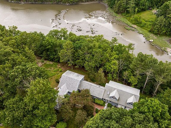 Stunning contemporary cape on Crommet Creek with views of Great Bay, set on 5.2 landscaped acres. The open-concept kitchen features an oversized island, gas stove with stainless steel range hood, built-in microwave, abundant cabinetry, generous workspace, flowing into a family room with wood beams, natural light, and sliders to the deck with sweeping bay views. The dining room and formal living room with corner fireplace, wood beams, and deck access offer inviting gathering spaces. The first floor also includes an office, powder room. A separate wing offers a first floor bedroom and full bath and upstairs an additional bedroom. Access the primary suite by a private staircase the bedroom provides bay views, oversized windows, built-in shelving, and a spa-like bath with large soaking tub, tiled shower, and double vanity overlooking the woods. A passenger elevator leads to the second-floor wing above the garage with living room, bedroom with zero-entry shower, and versatile flex space that would be perfect for an in-law suite. Outdoors, enjoy a pool, pool house with screen room, kitchen with refrigerator and bath, plus a covered outdoor kitchen with gas grill and sink. The property abuts conservation land, offering natural beauty, wildlife, and tranquil views. Car enthusiasts will appreciate the attached 2-car garage plus a detached heated carriage house with space for two more vehicles, workspace and an unfinished second floor. Truly a one-of-a-kind property that must be seen