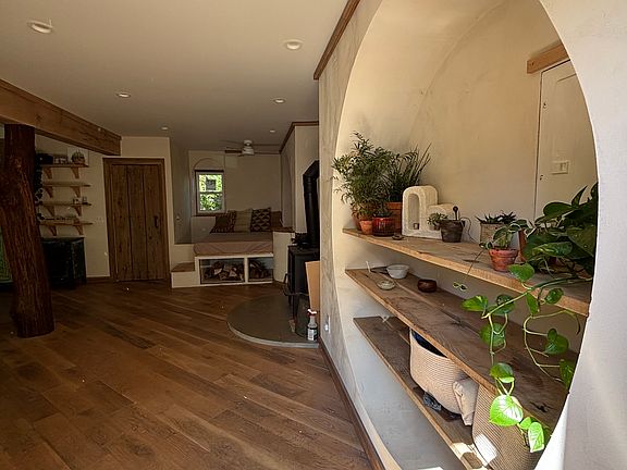 I have been building the house myself for the past three years, and it is full of beautiful details: natural lime plaster walls, hardwood floors, ambient lighting, sculptural nooks, two beautiful balconies (one with an outdoor clawfoot tub!), and a handmade wooden spiral staircase. The house is 1500sqft. It has 3bed 1.5 bath, and it has three stories (not ADA accessible). The house is heated with a combination of mini-splits and a wood stove. Renter must be comfortable using a wood stove properly. There is a beautiful fenced yard (just under 1 acre), garden beds, and two huge outdoor porches (one porch on the house, another large wooden deck in the yard). The driveway is very steep and bumpy. AWD not required, but it probably won't be a good fit for a small/low car like a Prius. The house is furnished (I am a minimalist, so it is sparse). One thing to note: The house is fully functional, but some aesthetic details are still unfinished. Some trim is still missing in certain places. It still feels very clean, inviting, and homey.