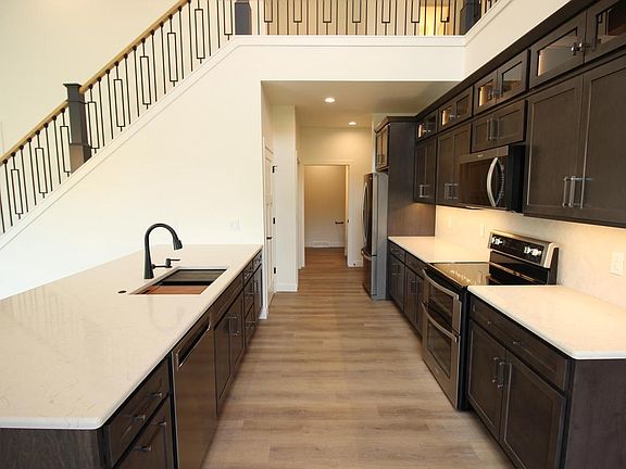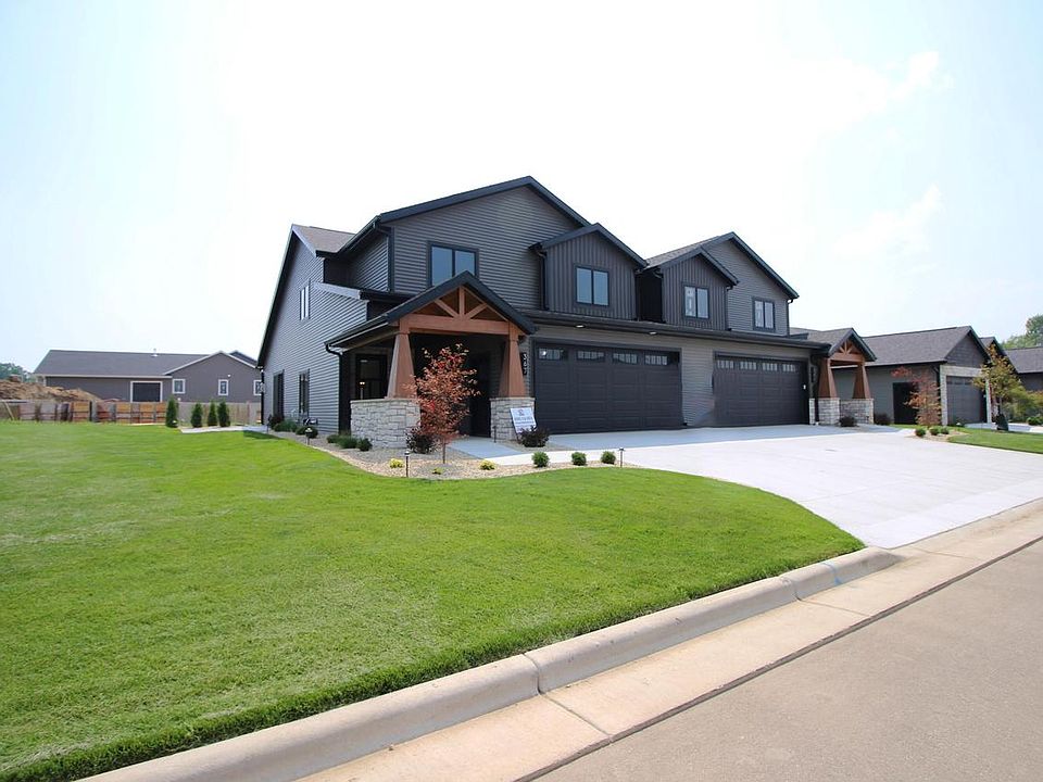 This new construction condo overlooks Ridge View Park and driving range & is located in Milton's newest residential development. As you walk through the front door you are met with 18' ceilings that showcase the open concept kitchen, dining & living room. The living room features a gas fireplace with direct access to your private patio made of stamped concrete and large yard. The primary bedroom is located on the main floor with tray ceilings, a bathroom that features a double vanity, low threshold shower entry with tile surround & a walk-in closet. Also on the main level you will find your laundry room & half bath. The upstairs features two bedrooms, an additional full bath & a loft space open to below. The basement has an egress window & rough plumbing for a future bathroom.