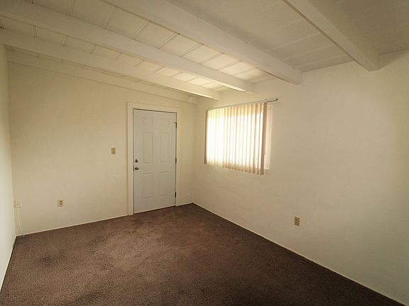 The galley kitchen has a small eat-in dining area with newer cabinets and countertops, newer vinyl flooring with a gas stove and refrigerator provided. Your bedroom features freshly painted wood beam ceilings and features a private bathroom with newer vinyl flooring. Other desirable amenities include vinyl windows and new blinds!