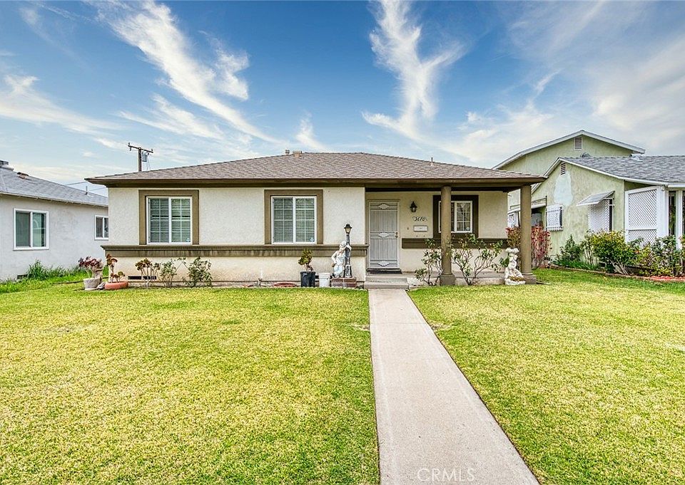 CHARMING and MOVE-IN READY SINGLE-STORY HOME! This delightful 3-bedroom, 1-bathroom home offers 1,382 sq. ft. of comfortable living space. Step into a warm and inviting living room featuring beautiful wood laminate flooring, which extends throughout the home. The bright and airy kitchen boasts raised panel cabinets, Formica countertops, a four-burner stove, a microwave oven, and a dishwasher. Adjacent to the kitchen, the formal dining room provides the perfect space for enjoying meals with family and friends. A spacious and cozy family room with a charming fireplace offers the perfect setting for relaxation and gatherings. The home is equipped with central HVAC for year-round comfort, and the foundation has been upgraded with earthquake bracing for added peace of mind. Step outside to a backyard designed for both relaxation and functionality, featuring a covered patio and double gates for easy access. An attached garage is conveniently located at the back of the home. Don't miss this wonderful opportunity !!!