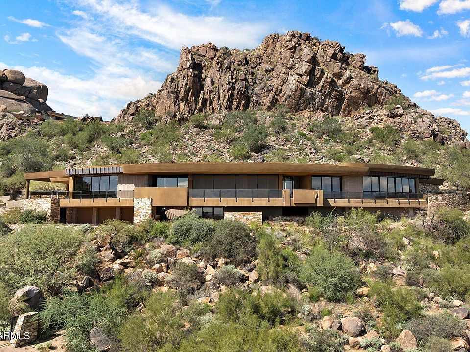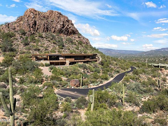 A striking architectural feat set into Black Mountain's eastern face, this bespoke estate rests on 2.7 acres of untouched desert terrain. Its graceful crescent form hugs the slope, embracing panoramic views of Scottsdale, Carefree, and the Sonoran horizon. Engineered with commercial-grade steel and natural masonry fused into the granite bedrock, it sits in perfect harmony with the surrounding boulders. Exterior finishes - patinated copper, hand-cut stone, and earth-toned stucco anchor it to the landscape. Refined interior appointments and masterful craftsmanship elevate every space, creating an atmosphere of timeless desert elegance. Years in development, and impossible to recreate - one could not replicate this home today for the offering price. Your inquiry and tour is warmly welcomed.