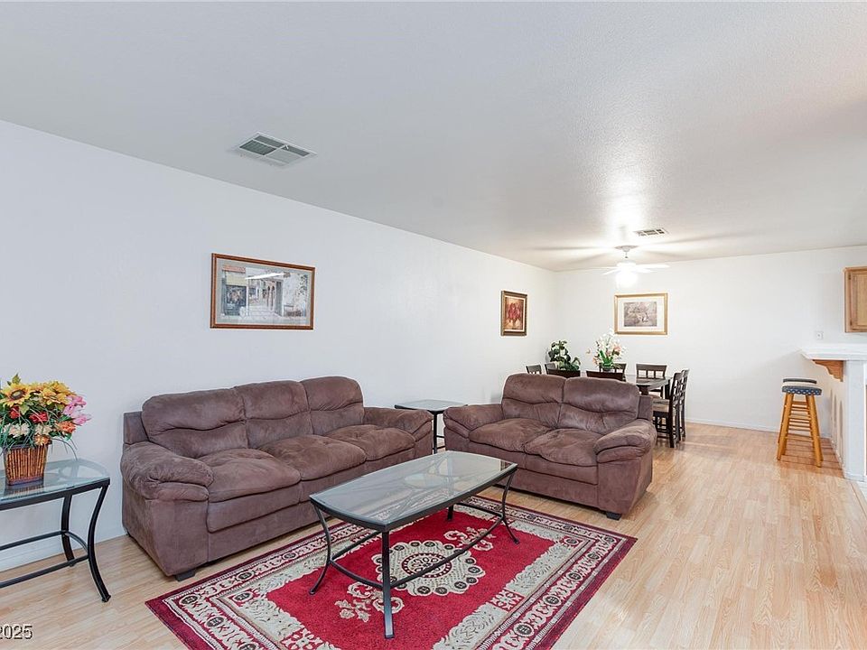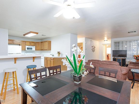 Beautifully maintained ground floor condo in the popular Sunhampton Condo community. Open floor plan featuring a large kitchen with a breakfast bar, separate dining area, lots of cabinet space, and all appliances included! Additionally, you'll get a spacious laundry room with DIRECT access to the attached one car garage. The primary bedroom includes a walk in closet. Located in a gated community with a pool and spa. Plus, it’s just minutes from Summerlin, the 95 freeway, shopping, parks, running trails, schools, and medical facilities.