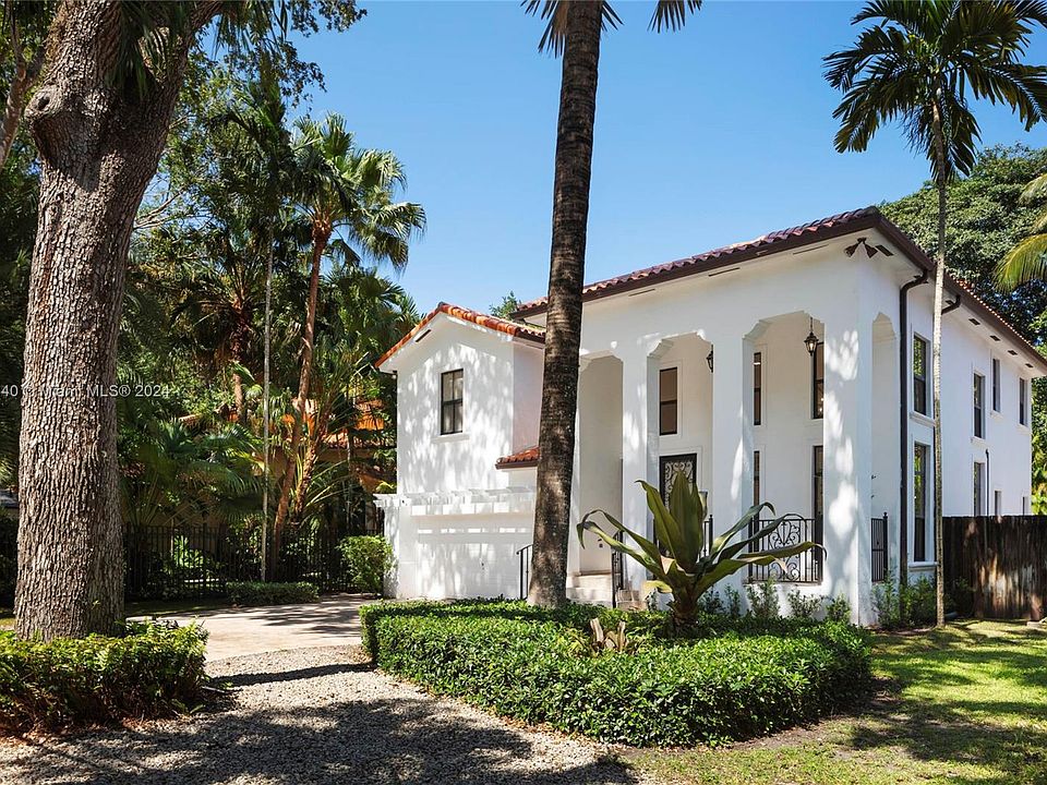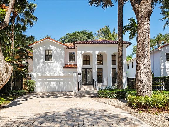 Bright move-in ready 2005 home on a great South Grove street among mature trees and beautiful estates. Enjoy spectacular curb appeal with marble paved driveway, dramatic archways, and wide front porch. Double height ceilings and abundant natural light welcome you inside. The floor plan offers flexibility with open common spaces to meet all your needs. Recently renovated kitchen has an island, counter seating, plus a breakfast area overlooking the pool. Guest bedroom and renovated full bath downstairs. Head upstairs and you’ll find two additional bedrooms, home office, and a luxurious primary suite with standalone tub, double vanity, makeup station, walk-in closet, and balcony. Private backyard features covered terrace, paved patio, pool, and majestic banyan tree. Get ready to have it all!
