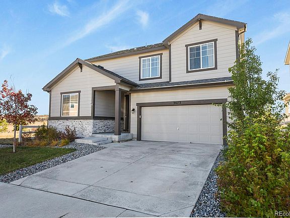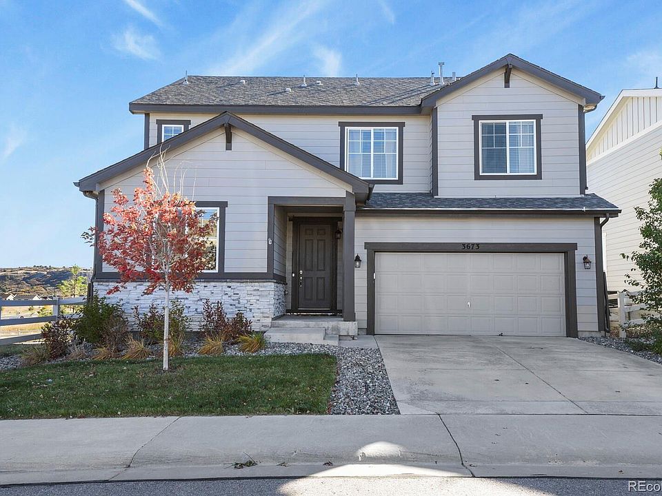 Welcome to your dream home in the sought-after Crystal Valley Ranch community! This spacious and stylish modern farmhouse offers almost 2900 square feet of thoughtfully designed living space, featuring 3 bedrooms, 3 bathrooms, a versatile loft, and a dedicated office with elegant French doors—perfect for working from home. The main level boasts extensive luxury vinyl plank flooring, leading you into the open-concept family room with a contemporary gas fireplace, mantel, and pre-wired surround sound—ideal for entertaining or relaxing. The bright and east-facing sunroom, currently used as a dining room, floods the space with natural light and connects seamlessly to the well-appointed kitchen, complete with a large walk-in pantry, tech desk, and modern pendant lights. Upstairs, retreat to the spacious primary suite offering a luxurious 5-piece bath and generous walk-in closet. Two additional bedrooms, a full bath with double sinks, and a loft area provide plenty of room for family, guests, or hobbies. The full, unfinished garden-level basement adds over 1,400 sq ft of potential—use it for storage, a home gym, or customize it to suit your needs. Crystal Valley Ranch is a master planned community with a community pool, recreation center, trails and parks. Rhyolite Regional Park is across the street with turf fields, playground, covered pavilions, bike park, and disc golf course. Don't miss this rare opportunity to own a beautifully updated home with room to grow, all for under $650K! Sellers are offering $20,000 towards closing costs and rate buy-down.