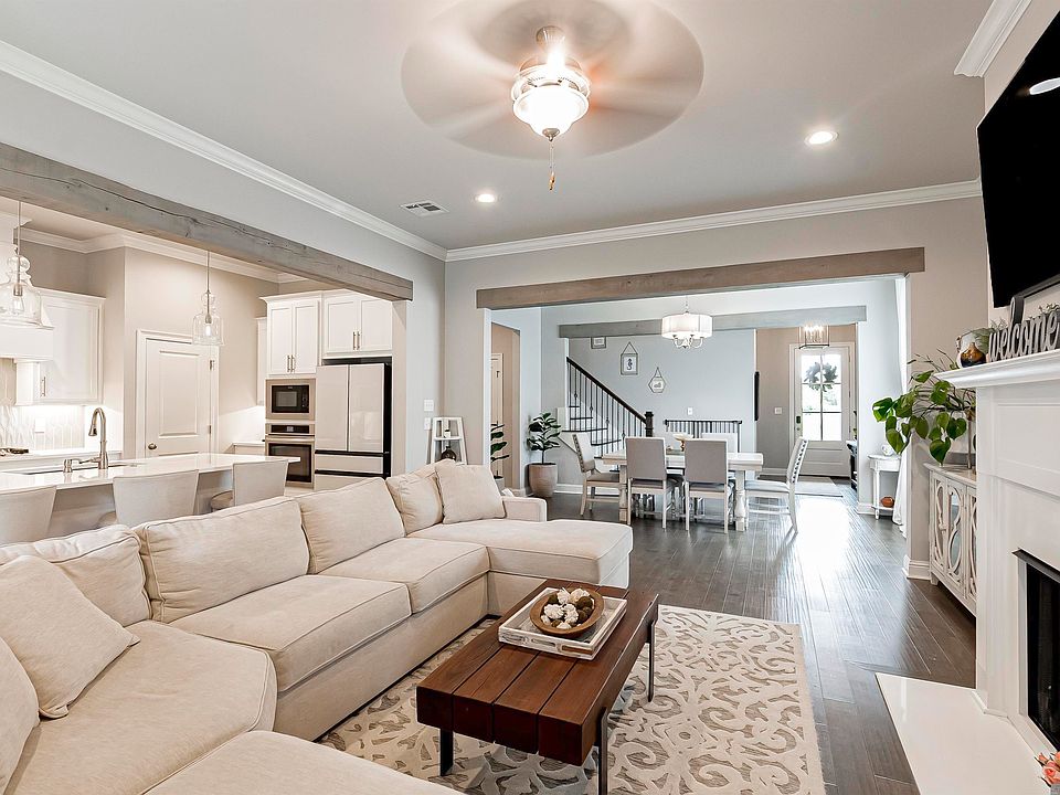 Do not miss this one!!!! Under 2 years old. This house has an additional bedroom and full bath downstairs. This floor plan is over 2590 sq feet, two stories, four bedrooms, three full bathrooms and a loft! You will enter this home into an actual foyer and staircase which is open to the open living and dining room. The dining, kitchen and living room is separated by exposed cypress beams in a distressed cypress gray stain. The gourmet kitchen has custom painted cabinets with flat panel doors, large center island with granite composite sink, hanging pendants over the island, walk in pantry, pure white quartz counter surface with a smoke “crayon” shaped tile back splash. The primary suite is located off the rear of the home next to the spacious laundry room and will feature a spa-like bath with dual vanities, framed mirrors, soaking tub, custom tiled shower and huge walk-in closet with shelving. There is an additional bedroom downstairs with a full bathroom. Upstairs will have two full bedrooms with walk-in closets, full bath with dual vanities and a 15'9" X 12'9" ft loft! Upgraded tile, satin nickel lighting and wood flooring throughout the living areas! The is 85 percent painted white brick with minimal stucco on the front. The large back porch is enclosed with an automatic screen and a fixed screen with an access door for ease to the outside. The yard is fully fenced in All white fans and the outdoor fans have been replaced. HOA includes use of the Golf Course!!!
