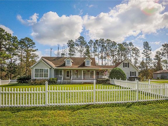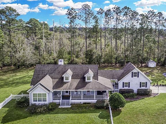 Off the beaten path tucked away on over 8 acres, this pristine 3 bedroom 2 bath home is the epitome of country living. As you cross the small creek and make your way up the winding driveway you'll notice that most of the property has planted grass and you'll likely spot wildlife such as deer, turkey and/or quail. The welcoming wrap around porch faces west and invites you to enjoy beautiful sunsets while overlooking the quaint picket fence and the stunning property beyond. The living room is open and airy with gorgeous hard wood floors and a massive hand crafted Florida fieldstone fireplace that leads to a large screened porch where you can watch the sun rise or occasionally view a rocket launch from the Kennedy Space Center. The kitchen is comprised of granite counter tops, wood cabinets, stainless appliances and a brand new top of the line refrigerator. The formal dining room has newly installed mason jar lights with dimmable Edison bulbs and ample room for a family or social gathering. As you make your way into the master bedroom you'll find plenty of storage with two closets and a spacious master bath complete with a jacuzzi bathtub, separate shower and double sinks. The property includes a shed and a 38x29 insulated and air conditioned building with built in shelving and connected water. This space could be used as a workshop, garage, man room and/or game room. The property is minutes to the Wekiva Parkway and US 441 for easy access to other surrounding communities of Central Florida.
