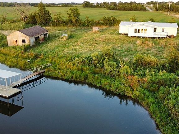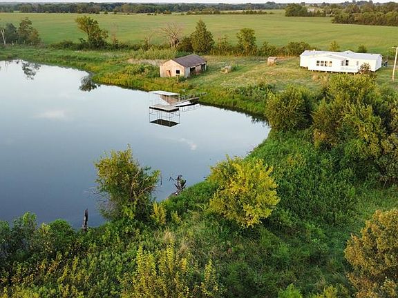 24 ACRES - POND VIEW - SPACIOUS 3 Bed/2 BATH. 3+acre pond has a covered dock, has been stocked with Bass, Catfish, Crawdads and Crappie and past owners say it is spring fed from the NE corner. Fully fenced with welded wire and 2 strand barb along the top of t-posts. With loamy soil and terraced terrain, this acreage produced years of watermelon/cantaloupe crops. Now, the rows of large, mature Persimmon trees are home to deer and turkey, and an abundance of other wildlife. This beautiful triple-wide manufactured home has over 2200sf and has been completely updated and refurbished with a new HVAC, septic tank with aerobic system, roof and is in the process of new metal skirting. The den has a fireplace, sliding glass doors to the back patio, 3 large windows with a view of the pond and sunset. Kitchen with island and tons of storage and countertop space.