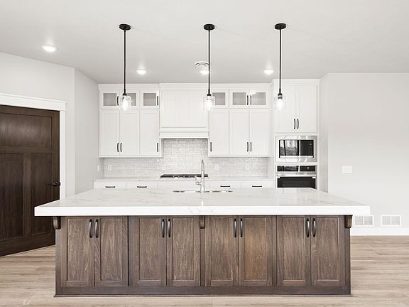 Electric fireplaceEat-in islandHigh-end finishesWalkout to the patioStone accentsClipped gable roofOpen-concept layout