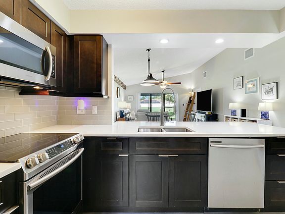 This beautifully updated 3-bedroom, 2-bathroom villa in Shadywoods offers both comfort and modern living. As you enter, you're greeted by impact windows in the front and kitchen, with a long impact window by the front door for added security and natural light. The spacious living area features laminate wood floors in the master and second bedroom, while the rest of the villa is elegantly appointed throughout. The recently converted front room now serves as a third bedroom, complete with custom closets. The kitchen is a chef's dream with all Samsung appliances and sleek quartz countertops. The laundry room has a new LG washer and dryer, installed in 2023. For peace of mind, the villa is equipped with accordion shutters throughout, including a phantom door at the entrance for extra protection. The HVAC system is brand new (2021), and the water heater was updated in 2019.