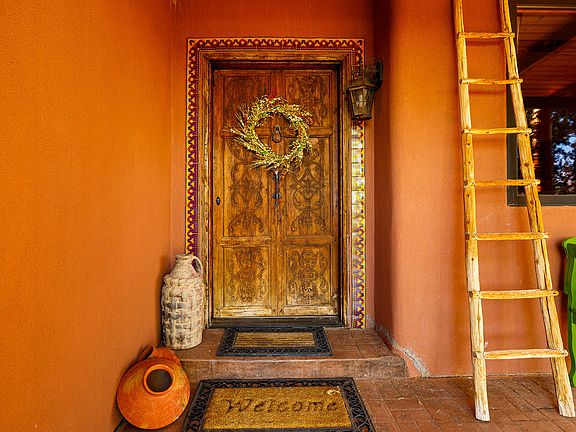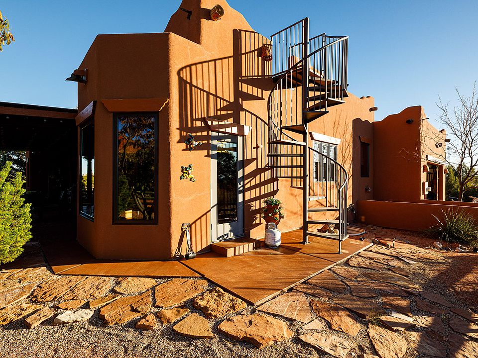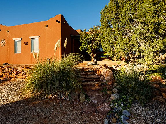 Step inside and feel the warmth of Southwest design - custom tile floors, imported sinks, and log timbers accenting the tall ceilings. A river rock fireplace anchors the spacious living area, while large sliding doors open to a private, covered patio perfect for quiet mornings or evening gatherings. The unique kitchen features a large island with bar seating and connects seamlessly to a sun-drenched dining area ideal for entertaining. The 3-bedroom, 2-bath layout features a large peaceful primary suite with its own bath and direct patio access and views that make every sunrise feel magical. Downstairs, you'll find a partially finished basement with one bedroom already framed in, offering room to expand or customize to your vision. A spiral staircase leads to the rooftop deck - your front- row seat to unforgettable sunsets and clear desert night skies. Set at the back of a 2.24-acre lot, this home sits high for unobstructed views of the red cliffs and the Kaibab Mountain range - a dream for anyone who loves the ever-changing desert light. Experience the artistry and serenity of true Southwest living in this one-of-a-kind Santa Fe masterpiece. Buyer to Verify all details.
