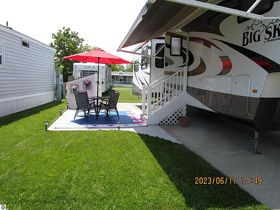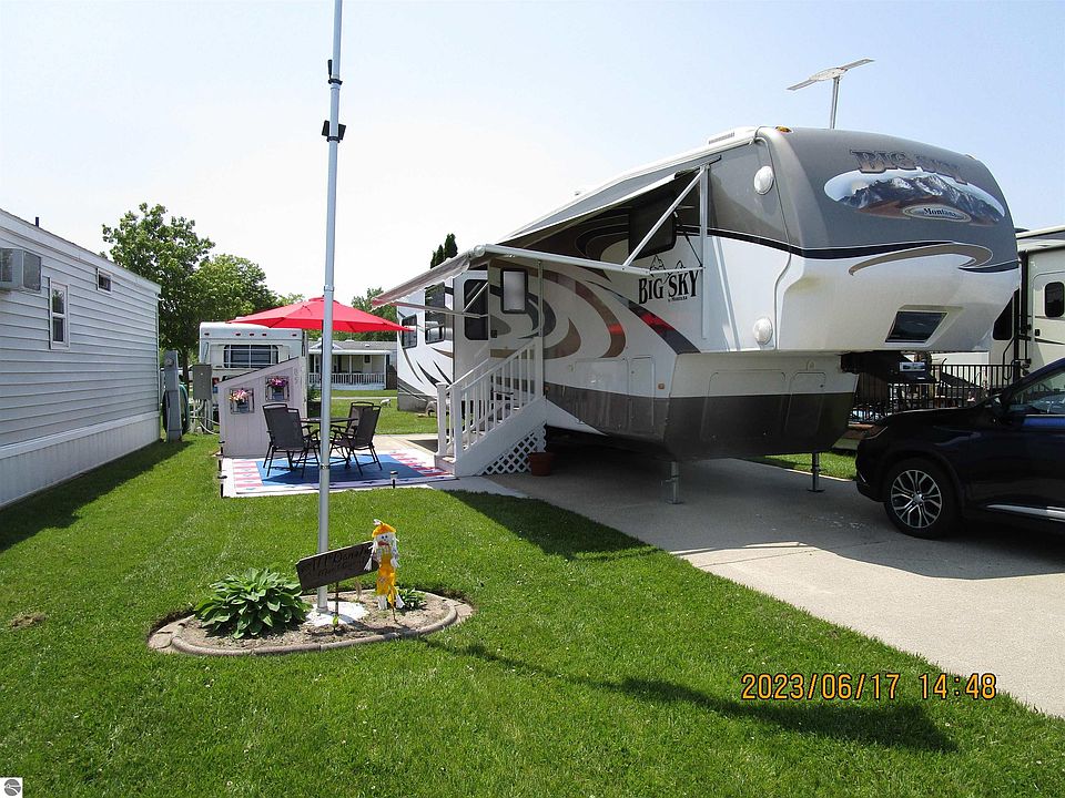 This is your summer dream place, that really has it all. This beautiful 38' BIG SKY MONTANA 5th wheel has 4 slides with awnings, back living area with fireplace, bedroom suite, was well build and well care for. This unit sits on a 30x60 cemented with room for your outside patio . This campground features a clubhouse, newer heated pool, pavilion area, laundry room, bathhouse & a playground for the smaller ones. Also includes 600' sandy beach to enjoy swimming, kayaking, jet skiing. Did I say "This community has it all" .