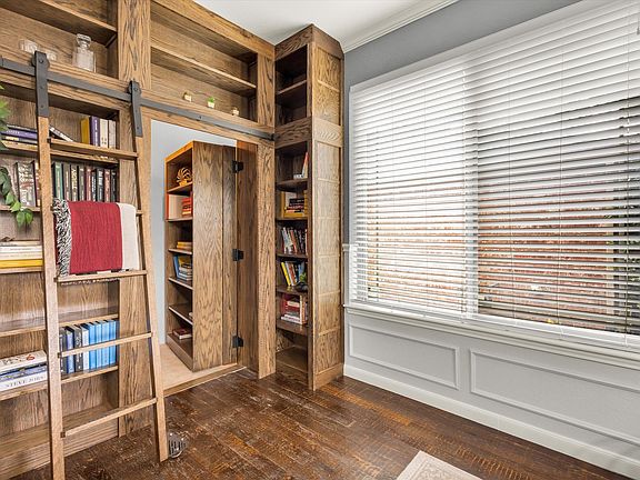 Step through the front door and into a spacious, flexible front room that can be tailored to suit your lifestyle – whether that’s a formal dining area, cozy second lounge, or contemporary office. A standout feature is the custom-built bookcase, which cleverly conceals a hidden storage space – a rare and thoughtful detail that adds both character and function.