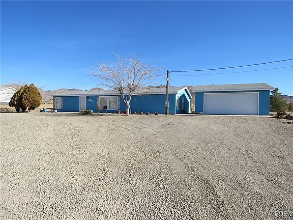 Beautiful Views ~ 1.17 Acres ~ Detached Two Car Garage ~ Three Bedrooms ~ Two Full Bathrooms ~ Water & Power~ NO HOA ~ NO CC&R s ~ Horses are OK. This groundset doublewide manufactured home is 1,774sf. It has a large living room with big windows and opens into the dining area that has a slider out to the rear patio. Kitchen has plenty of prep space with a breakfast bar and separate island. Stainless refrigerator, microwave and 5 burner propane range. Kitchen cabinets and bathroom vanities have been replaced with higher quality cabinets and solid surface counter tops. The split floor plan puts the 15 X 15 main bedroom on the south side of the home with a walk in closet, linen closet, deep jetted tub & separate walk in shower. Bedrooms two and three are on the north side of the home and share the hall bathroom with a tub shower combo. Laundry Room has electric hook up, upper cabinets, open shelves and soft water system. Home has vaulted ceilings, sky lights, ceiling fans, window coverings, all wood laminate flooring, central propane heat, central air, electric water heater and new roof on home and garage in 2024. Two Storage shed and the detached 22 X 24 deep garage has a new door and auto opener ~ 3676 N. Bagdad Rd. Golden Valley AZ. ~ Eight Miles from Downtown Kingman AZ. From Highway 68, north on Bacobi Dr. right on Burro, right on Bagdad, it s about a mile from the highway, paved up to Chino.