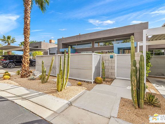 Modern desert living at its best in Palermo Palm Springs. This sleek and sophisticated single-level home impresses from the start with its private entry and two inviting courtyard patios perfectly framed by dramatic mountain views. Inside, stained concrete floors, soaring ceilings, and clerestory windows create a bright and open atmosphere that defines the Palm Springs lifestyle. The stylish kitchen flows easily to the living and dining areas, ideal for entertaining or quiet weekends away. The bedroom retreat features a large walk-in closet and direct access to the patio, while the spa-inspired bath offers a walk-in shower and modern finishes. Updates since 2024 include a new water heater, dishwasher, microwave, washer, dryer, ceiling fan, and fresh interior paint. Located within a gated community, this residence is just steps from one of the pools and spas and enjoys one of the best positions in Palermo with unobstructed west-facing mountain views. Residents enjoy resort-style amenities including a clubhouse, fitness center, two pools, and two spas. Fee Land (you own it) and just minutes from downtown Palm Springs make this the perfect full-time home, weekend escape, or investment opportunity. Take the Matterport Virtual Tour for a better sense of flow.