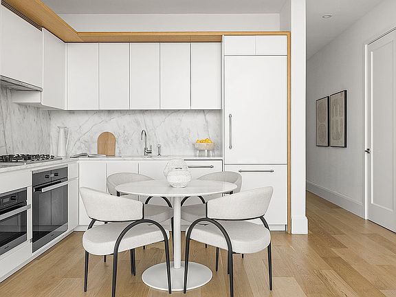 VU's light and airy interiors are carefully crafted by renowned interior designer Paris Forino to complement soaring ceilings and panoramic city and East River views. Living spaces in soothing neutral tones with handsome accents create a sophisticated aesthetic. Kitchens at VU imbue a feeling of comfort and convenience. Appointed in a sophisticated and light palette of natural materials such as marble, bleached oak, and white lacquer, outfitted with Miele appliances, they are a chef's dream. Spacious primary bathrooms feel like a tranquil spa getaway with walls clad in oversized soft white marble tiles and an intricate mosaic floor pattern comprising of three different marbles. Sinks and showers are complimented by The Grace Collection, Paris Forino's custom line of faucets and fixtures for Waterworks in polished chrome, produced exclusively for VU New York.