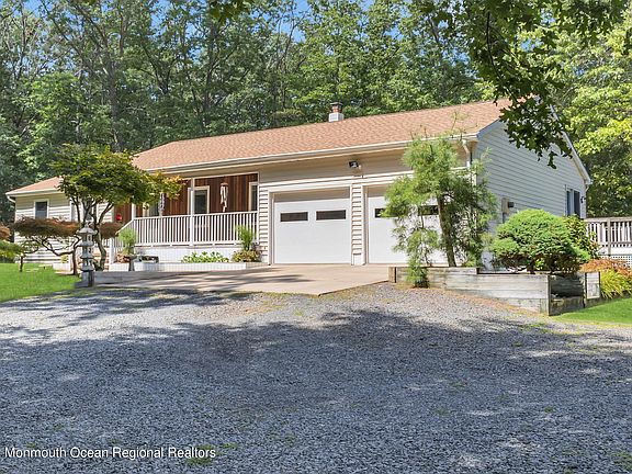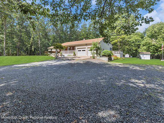 Privacy galore! Spacious ranch home sitting on over 4 acres of land, with a beautiful fishing pond, this home has it all! This 3 bedroom, 2 full bath home features a huge living room, dining room, eat-in kitchen ,full unfinished basement , front porch and a wrap around porch plus a 2 car garage. Amazing yard with a large patio and 3 storage sheds! Home is located close to I-195, the Jackson Outlets and Six Flags Great Adventure. Rural location, yet not too far from major roadways, you will love living here.