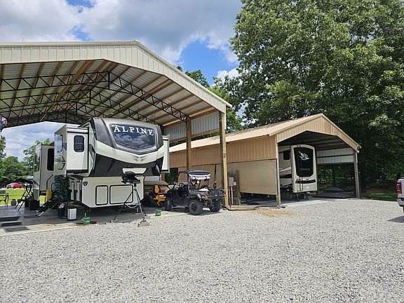 White Oak Landing Lots 207, 208, 209 A & B – 4 lots total (3 waterfront on White Oak Creek, flowing to the TN River’s main channel!). Includes two large 50 ft pole barns, a screened-in porch with isinglass, a small boat dock, full hookups for two RVs and approximately 175 ft of waterfrontage! Ideal for buddy RV camping, multi-family use, or storing all your toys! Mature trees offer ample shade and privacy. No HOA, so you can rent out the lots! Annual maintenance fees of $1140 covers road maintenance, community boat ramp, community dock, picnic pavilions, fire pit,playgroud area and dumpster service. Located in an RV resort community just north of Clifton, TN, near lively Clifton Marina and Ross Creek Landing Golf. 35 minutes to Savannah’s Walmart and Lowe’s, equidistant between Memphis and Nashville. The 3 waterfront lots total ~0.59 acres; the unimproved back lot (B) is ~1.08 acres. Perfect for outdoor lovers—kayak, canoe, fish, or swim with sandy beaches nearby!